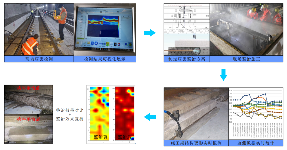 公司长期致力于提供轨道结构病害“监检治”一体化综合服务,不断探索新材料、新技术、新装备及高适应性的工艺工法,针对不同病害特征制定科学合理的专项整治方案,结合公司检测、监测及咨询评估等丰富经验,为高铁后期运维提供有力技术支持。