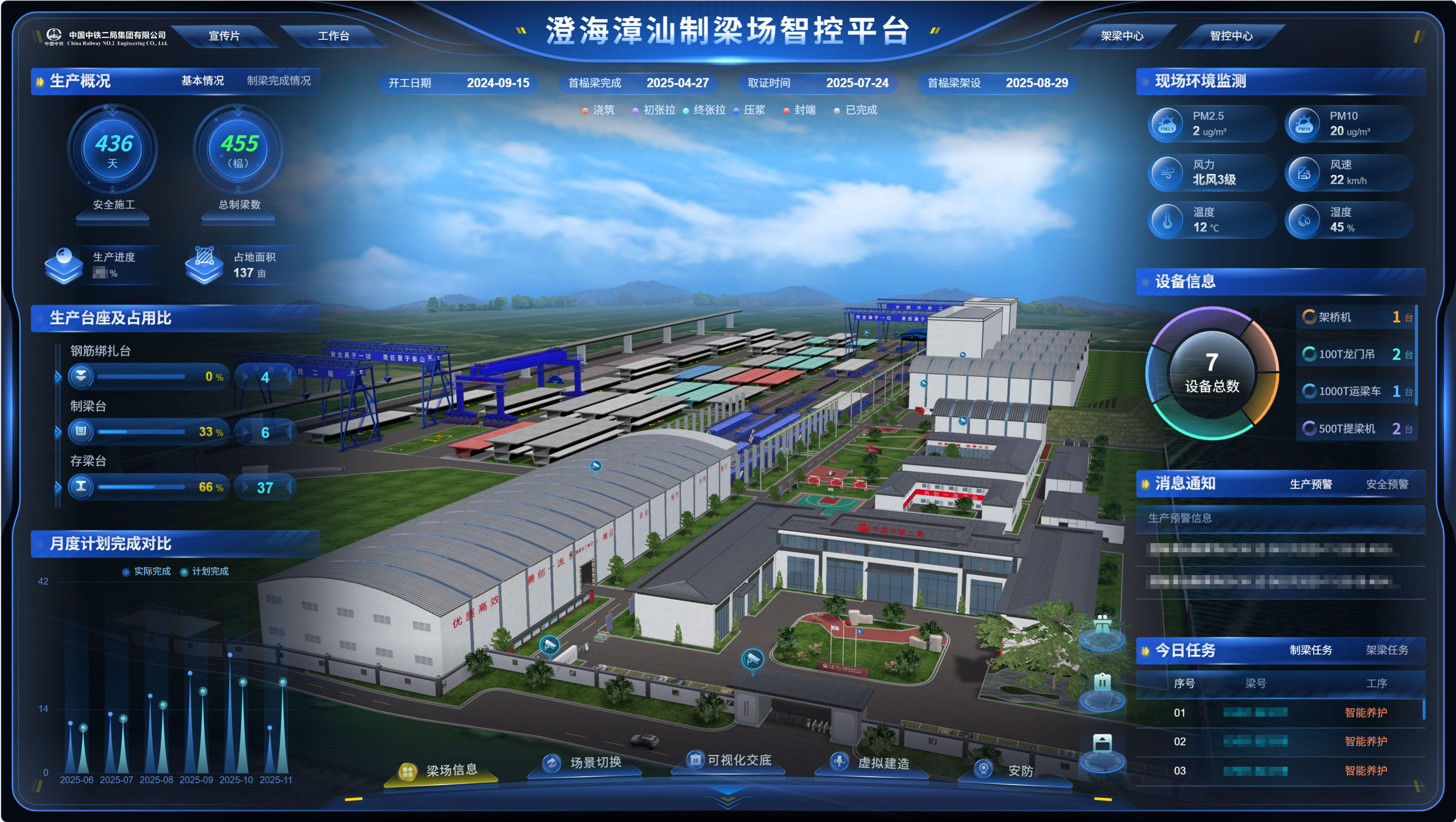 交大智能自主研发的智能梁场生产管理系统依托三维可视化平台,实现梁体生产全生命周期的数字化管理。系统集成生产进度、台座状态、设备信息等数据,实现生产过程可视化;通过视频监控与人员设备定位,强化现场实时管控;并关联试验室、拌和站、钢筋加工等多个子系统,实现原材料追溯、张拉压浆等关键数据的集中管理。该系统推动梁场管理向智能化、精细化、标准化升级,助力交通基础设施智慧建造。